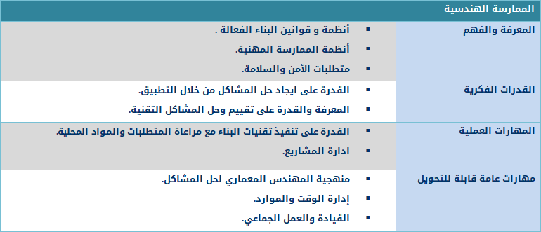 إن مخرجات الهندسة المعمارية هي نظام يتكامل مع تخصصات متعددة في علوم الهندسة المدنية والبيئية وجيولوجيا الأرض وفيزياء المواد وغيرها من العلوم الأساسية. و لما تقدم يمكن وضع سمات مخرجات هذه الدرجة العلمية كما في جدول رقم (1) : معايير محتوى برنامج الهندسة المعمارية