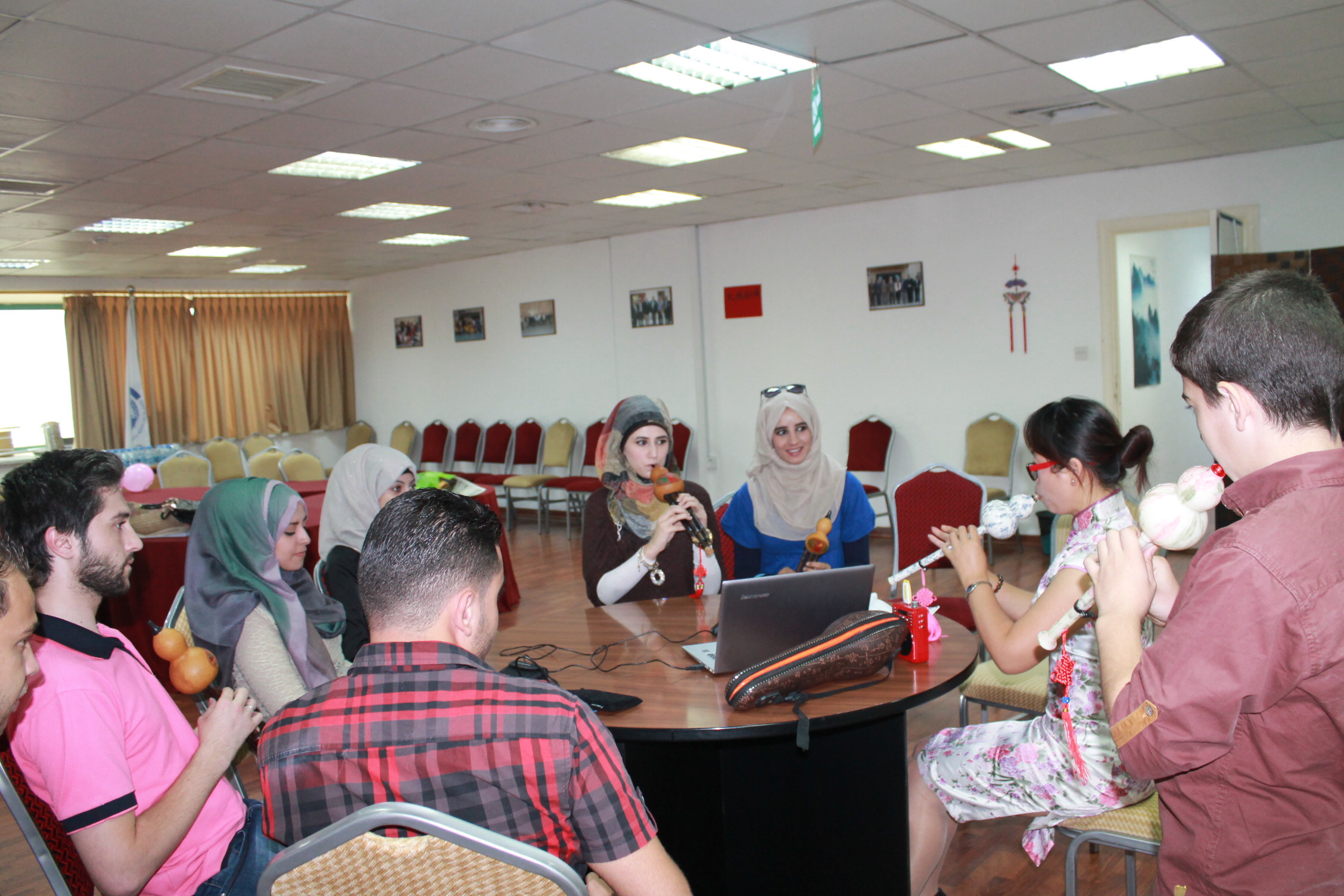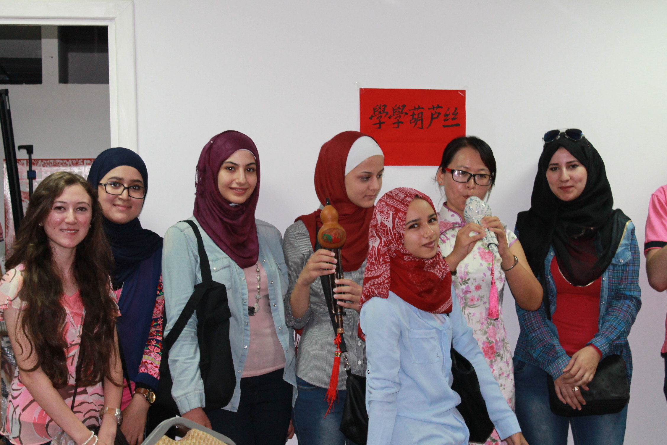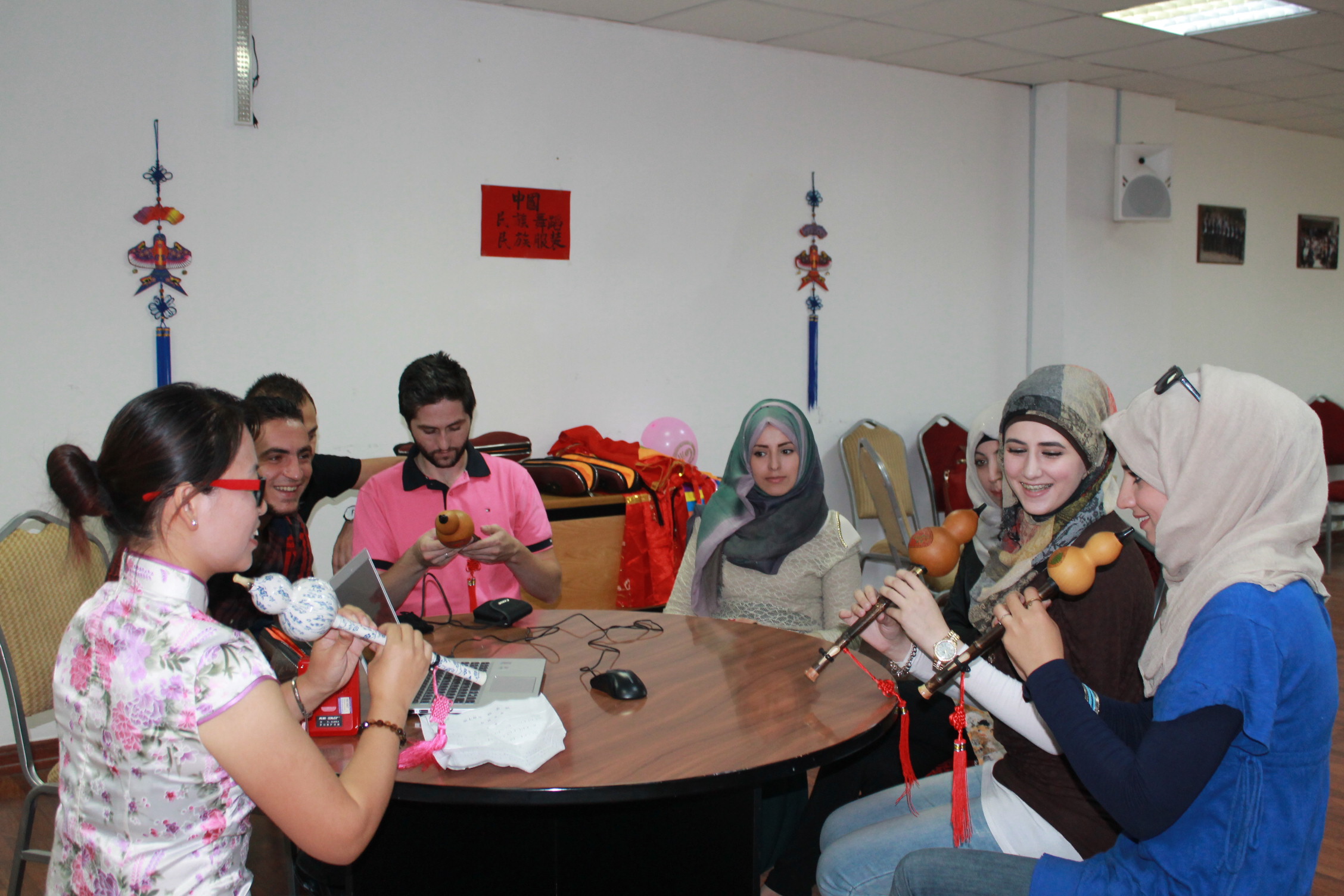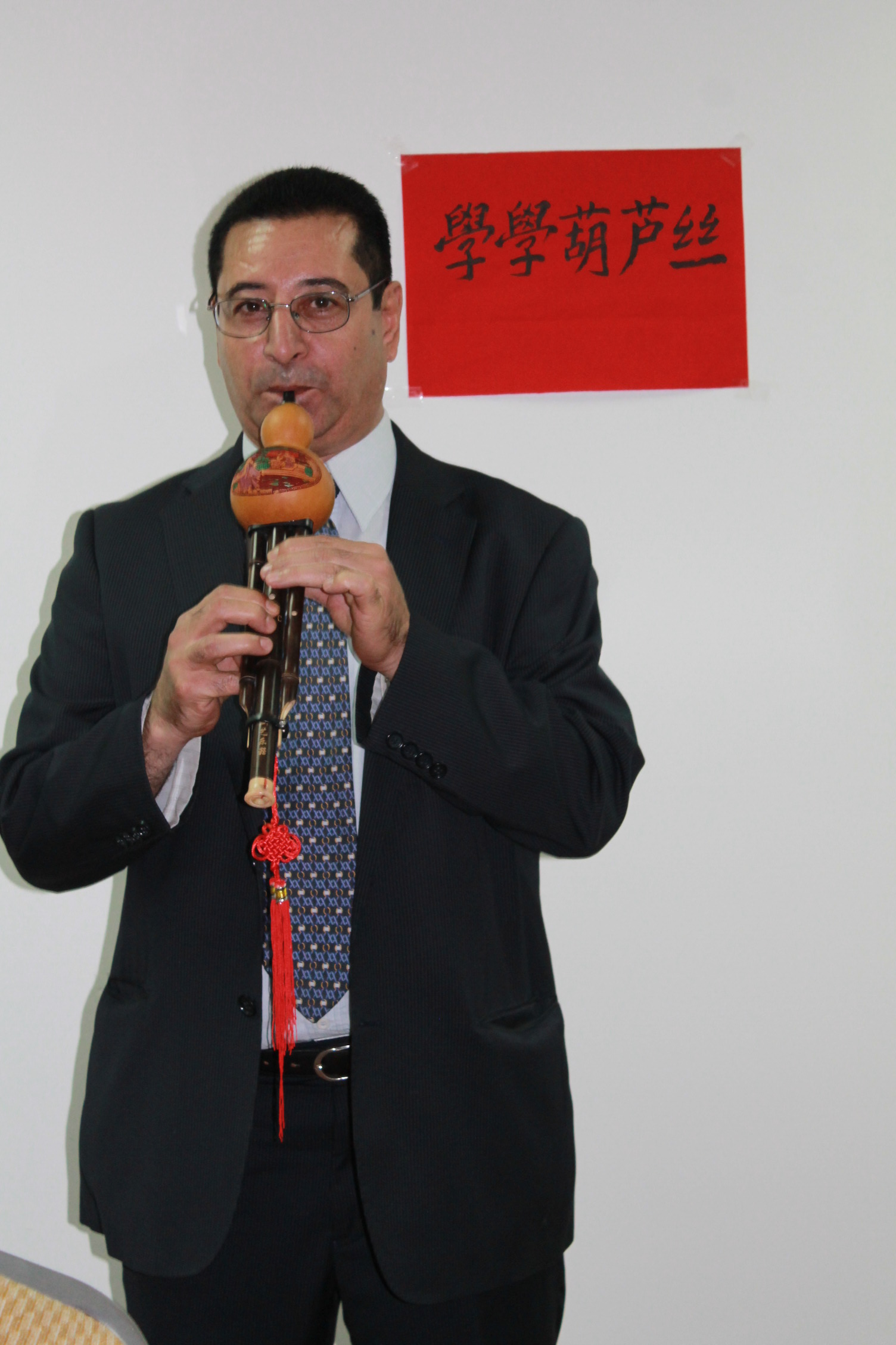 Jordanian director Dr. Ghazu playing the cucurbit flute.JPGMiss Feng Song teaching the cucurbit flute.JPGStudents learning to play cucurbit flute.JPGThe fans of cucurbt flute.JPG