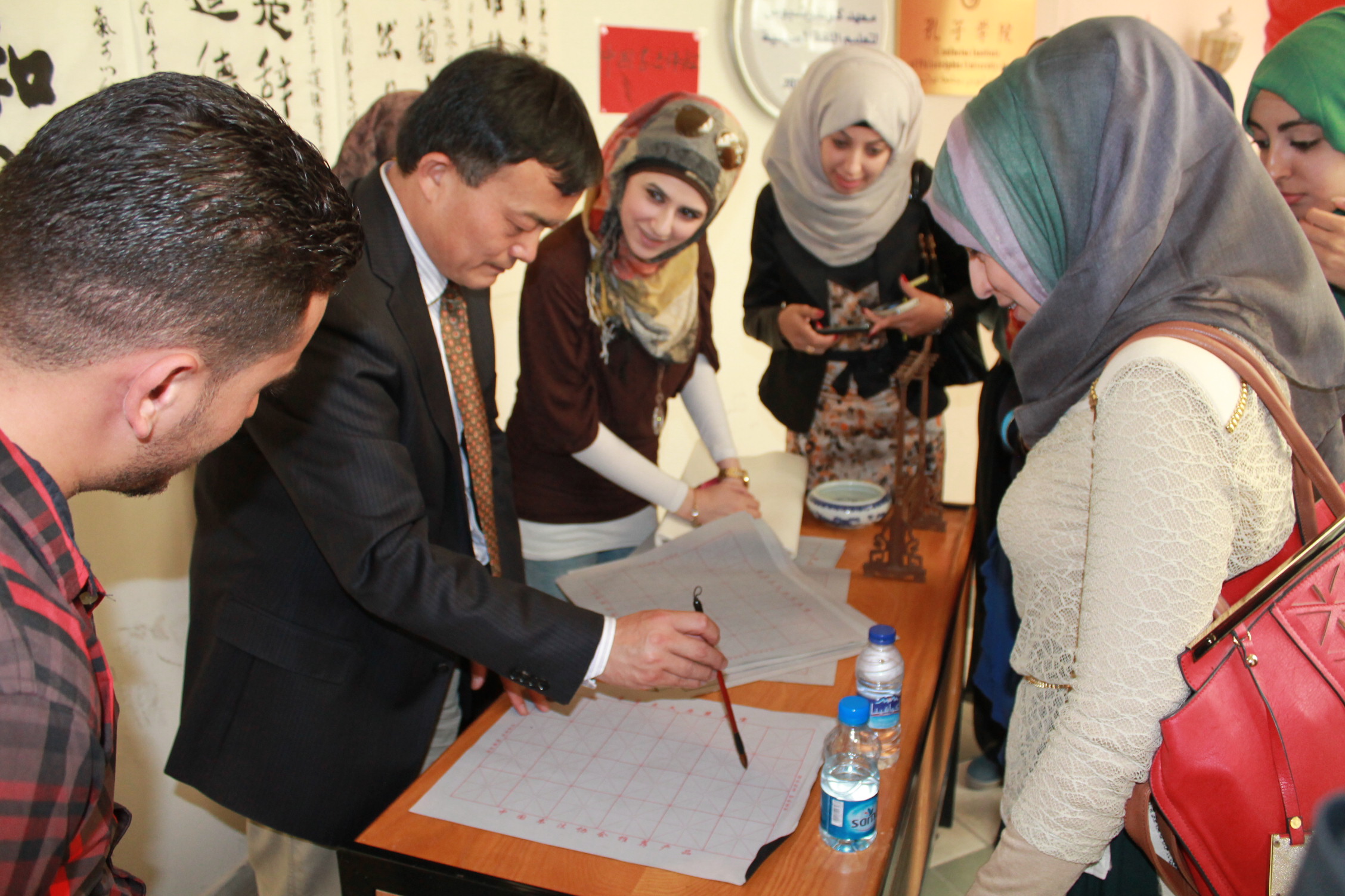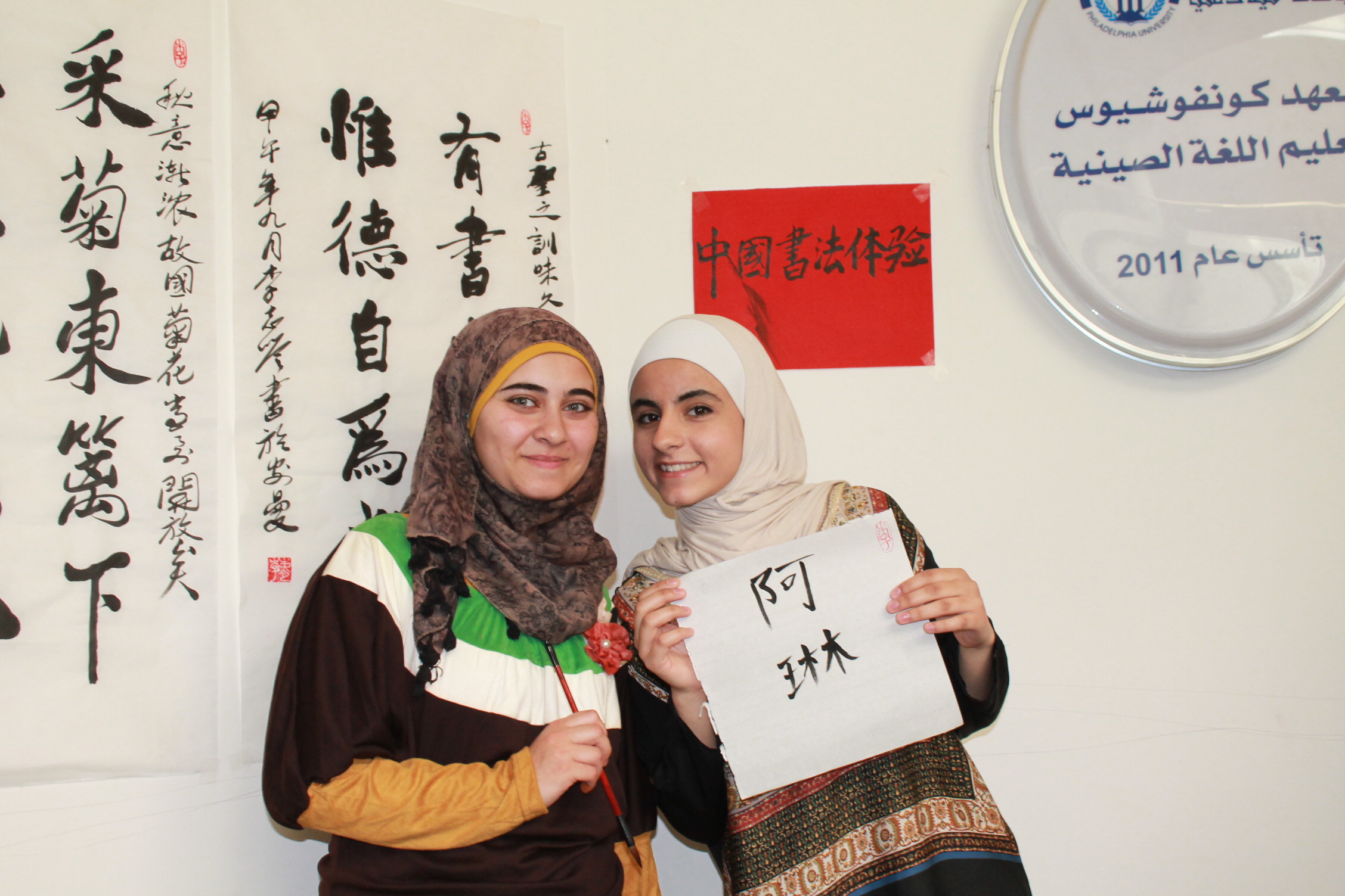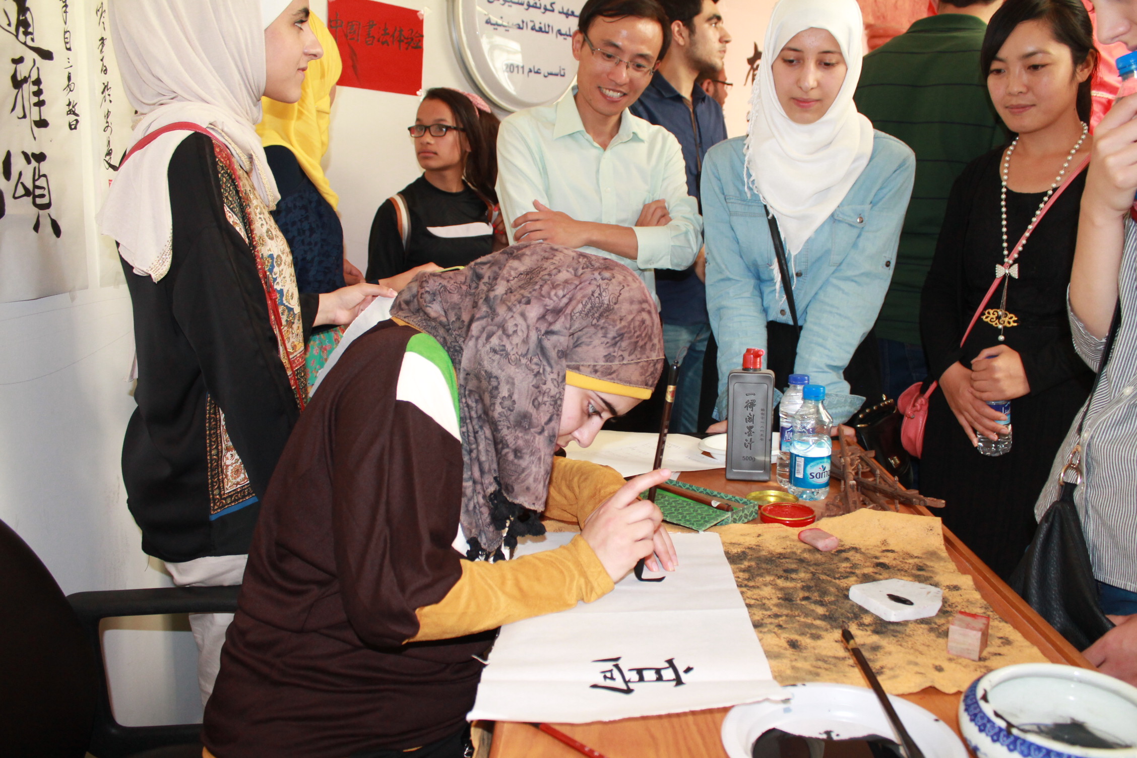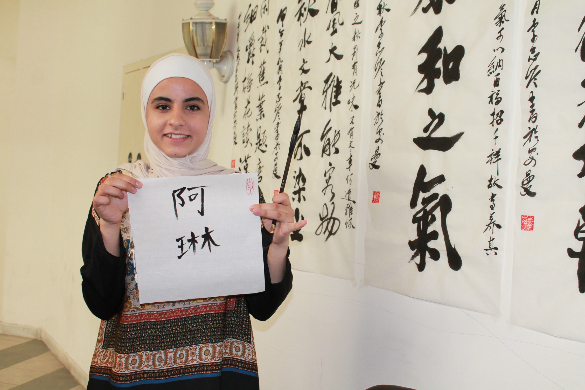 A student and her work of Chinese calligraphy.JPGA student writing Chinese calligraphy.JPGA student writing with Chinese writing brush.JPGAnother student trying Chinese calligraphy.JPGChinese director, Dr. Li teaching Chinese calligraphy.JPGParticipants with teachers of Confucius Institute of PU.JPGThe students with their works of Chinese calligraphy.JPGThis is my Chinese name.JPGWell done.JPG